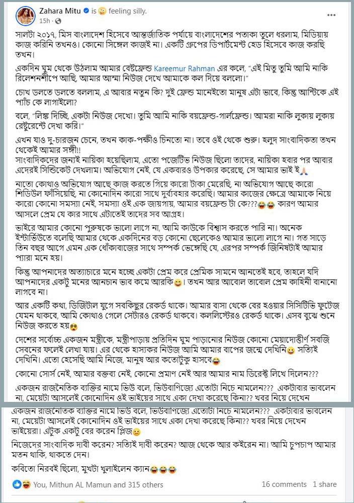জাহারা মিতু লিখেছেন, ‘একজন রাজনৈতিক ব্যক্তির নামে ভিউ বলে, ভিউবাণিজ্যে এতটা নিচে নামলেন? একবার ভাবলেন না, মেয়েটা আসলেই কোনোদিন ওই ভাইয়ের সঙ্গে একা দেখা করেছে কিনা? খবর নিয়ে দেখেন ভাইয়েরা। এটুক একটু বের করেন প্লিজ। নিজেদের সাংবাদিক দাবি করেন? সত্যিই দাবি করেন? আজ থেকে আর কইরেন না। আমি চুপচাপ আমার মতো থাকি, থাকতে দেন। কবিতো নীরবই ছিল, মুখটা খুলাইলেন ক্যান?’